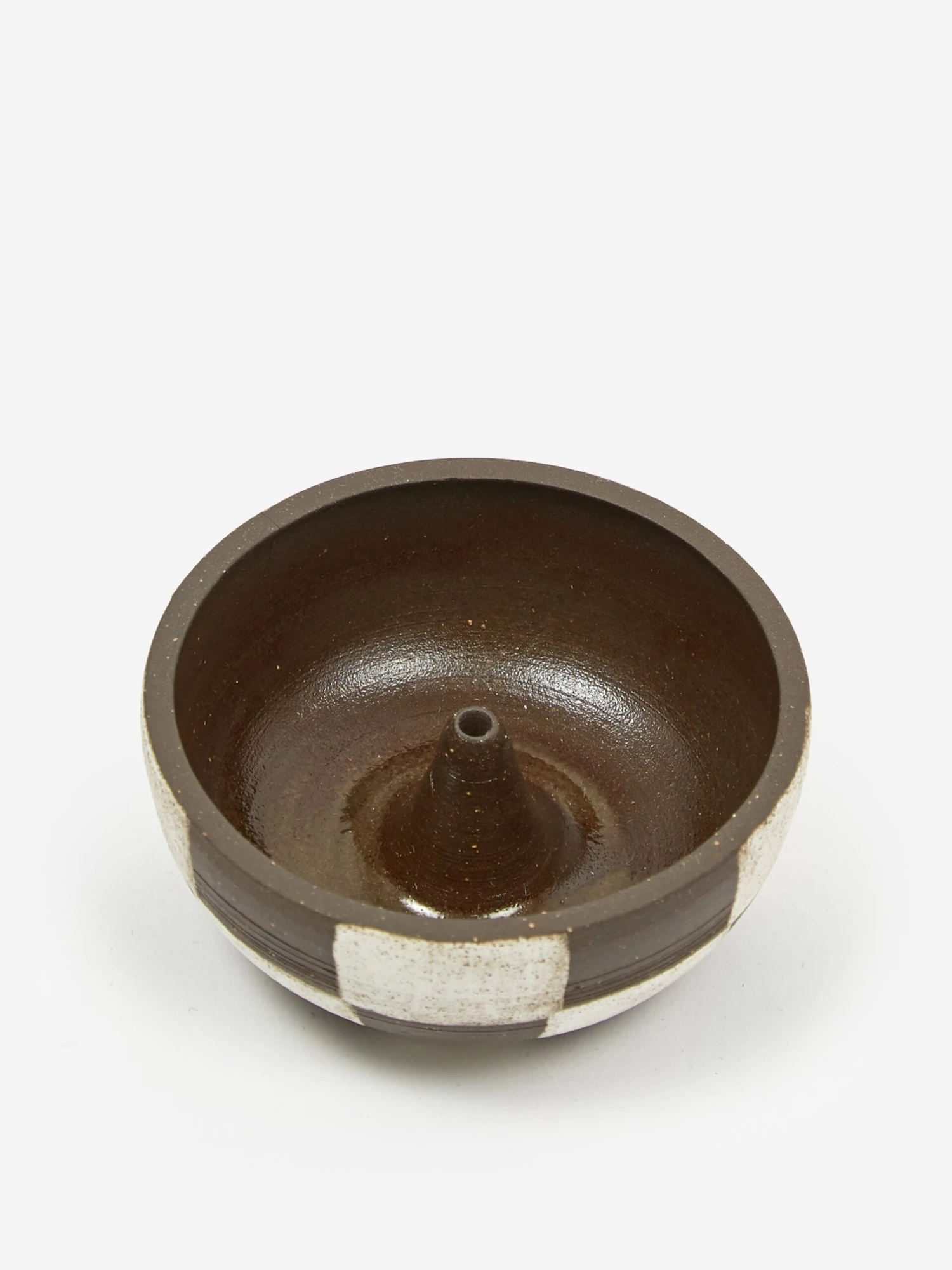 This small stoneware bowl by NYC potter Mellow has a spot to stand an incense stick inside and is designed to catch the ash it creates while burning. It’s a rich chocolate brown colour with a white check on the outside.