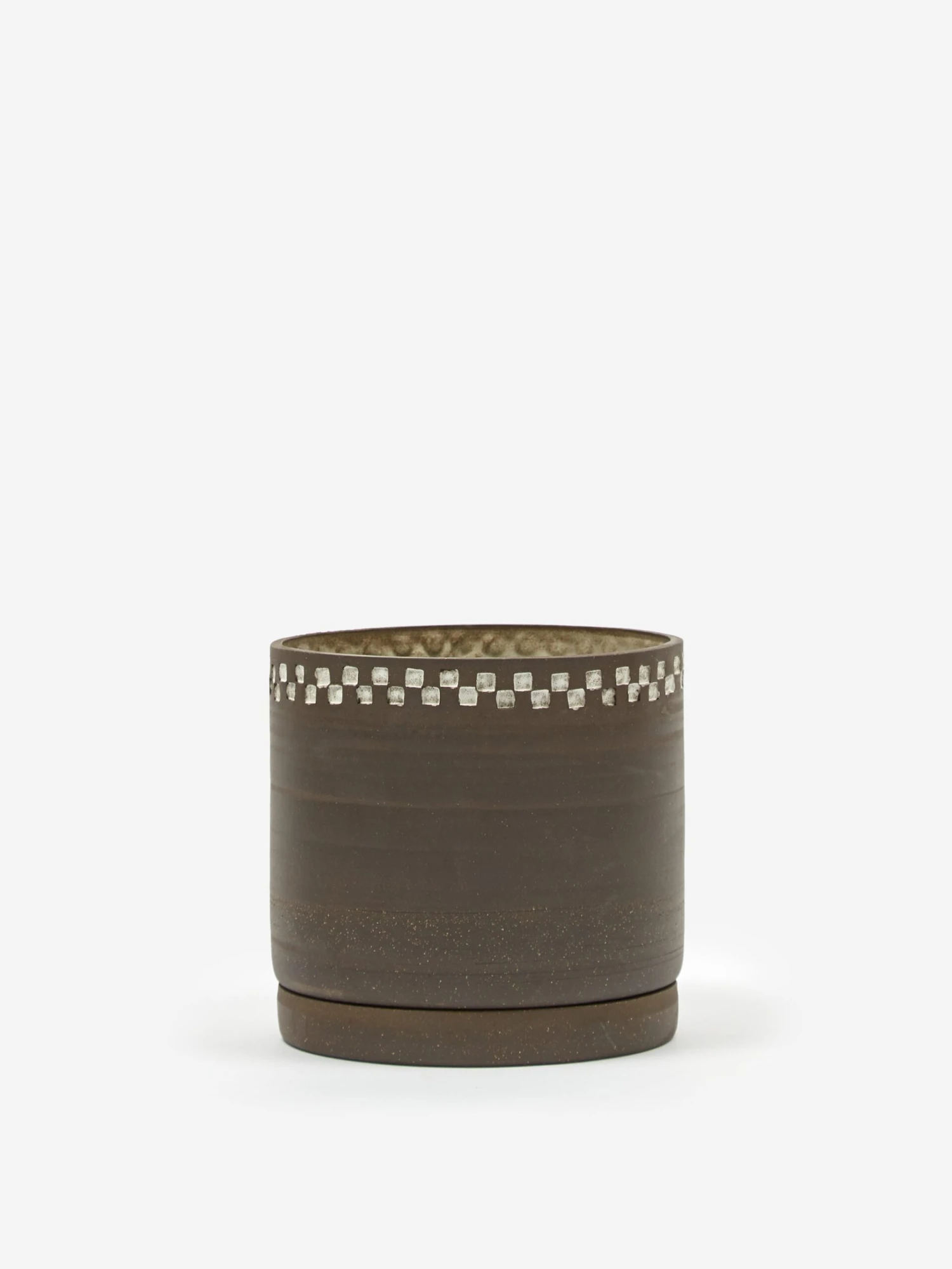 This planter by NYC-based potter Mellow is crafted from chocolate-coloured stoneware. It has a decorative white check and a matching stone lid.,